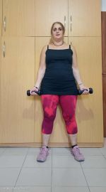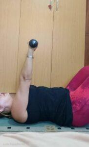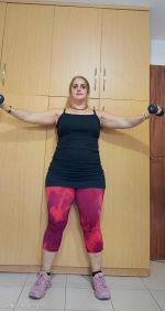 Working the shoulders and arms. Keep your elbows at 90 degrees the whole time. Imagine the weights as two glasses full of water, spilling the water as you raise your elbows up. Do 20 repetitions.
