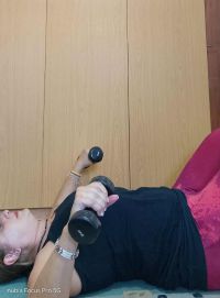 You can do this exercise on your bed or floor. At the gym you would be on a bench. Keep your elbows at 90 degrees when you go down. This exercise works the chest and arms. Do 20 repetitions.