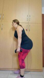 Go to your kitchen bench and put your left elbow on the bench, holding the weight in your right hand. Take a step back with the right leg, and lift your butt up towards the ceiling, so your torso is straight, not hunched forward. Now start with your right arm hanging down, and pull the elbow up towards the ceiling and back down.